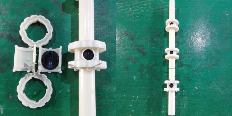 4、曝氣器由上、下管夾、單孔膜片、曝氣器緊固件、ABS 管道等部件組成的,所有部件在安裝時應(yīng)清洗干凈。按照設(shè)計要求組裝好。單孔膜片應(yīng)安裝在上管夾出氣孔上,管道上的出氣孔應(yīng)與單孔膜片上的孔上下對好,下管夾的定位銷(突起)應(yīng)插入ABS管道與出氣孔相對的定位孔中。曝氣管上、下管夾位置固定好后,應(yīng)用固定圈在上管夾和下管夾兩端擰緊,并旋轉(zhuǎn)到一定角度后鎖緊固定。